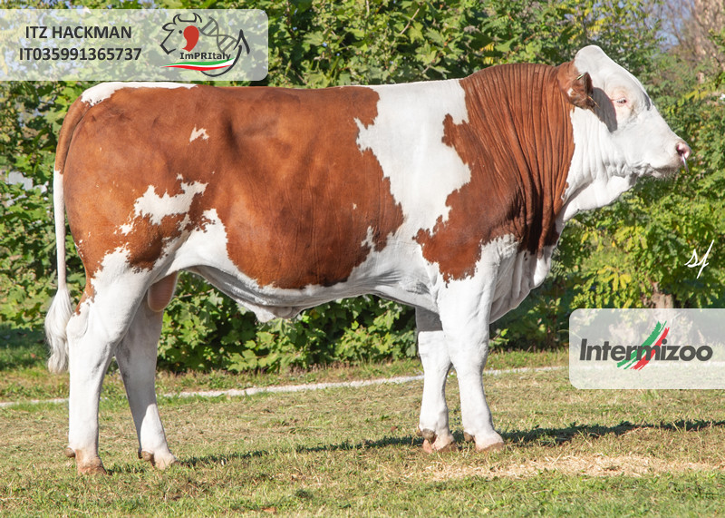 Hackman è un toro che incarna tutte le caratteristiche desiderabili di una razza a duplice attitudine, partendo dal latte, passando per il fitness e arrivando alla carne. Il padre è il toro genomico tedesco Hitachi, a suo tempo padre di toro, molto positivo per indici arti e mammella. Il nonno materno è il toro provato Mydarling, particolarmente famoso per l’altissimo indice latte e arti, mentre il bisnonno materno è il toro provato Der Beste che si distingue tutt’oggi per l’altissimo indice mammella. Hackman rappresenta la prefetta sintesi delle varie linee di sangue, combinandole in un mix davvero sbalorditivo: primo fra tutti spicca l’indice latte di +1.080 kg, nonostante i titoli siano negativi sia per grasso che proteina (-0.09 e -0.14 rispettivamente), mantiene comunque un buon livello di materia utile per un totale di 60 kg. Dal punto di vista del fitness, combina un buonissimo indice cellule somatiche (110) a una buona mungibilità (106) e un ottimo indice longevità (116). Il tutto si traduce in un indice salute di 120. La morfologia è protagonista assoluta con indici molto alti sia per arti che mammella (122 e 121 nello specifico). È proprio sugli arti che Hackman non teme rivali, infatti ha ricevuto egli stesso una valutazione morfologica di 86, trasmette arti asciutti con pastoie forti e un indice salute del piede di 111. Per quanto riguarda la mammella, registra valori molto alti per gli indici relativi alla lunghezza posteriore e anteriore e la forza dell’attacco anteriore. Va a compensare molto bene la posizione e la direzione esterna dei capezzoli, mantenendone in perfetto equilibrio la lunghezza, con la tendenza a ridurne il diametro. Non da ultimo, possiede le β caseine A2A2.